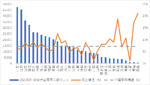 2023年各。ㄖ陛犑校┥鐣(huì)消費(fèi)品零售總額及同比增速