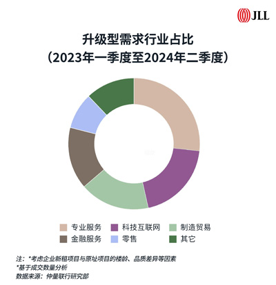 各行各業(yè)均體現(xiàn)出辦公環(huán)境升級的訴求。以交易數(shù)量來看,在所有升級案例中,專業(yè)服務(wù)業(yè)的成交數(shù)量占比達27%,體現(xiàn)出該行業(yè)更加靈活的租賃決策,其中,律師事務(wù)所的升級需求尤為顯著。在2023年第一季度至2024年第二季度的律所搬遷案例中,升級型需求超過95%?萍蓟ヂ(lián)網(wǎng)和制造貿(mào)易類企業(yè)位居其后,當前的市場環(huán)境提供了大量與該行業(yè)租金承付范圍較匹配的優(yōu)質(zhì)新近竣工項目,鼓勵此類租戶在優(yōu)先成本考量前提下,尋找到適合的升級機會。金融服務(wù)企業(yè)就其搬遷總量而言,升級型需求相對有限,主要原因在于大多數(shù)金融類租戶的原址品質(zhì)較高,而該行業(yè)代表性搬遷對區(qū)位的粘性較為明顯,尤其是銀行、保險等傳統(tǒng)金融企業(yè)。
