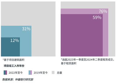 2019年至2024年上半年,上海全市累計新增甲級辦公樓面積達547萬平方米,占整體甲級辦公樓市場總存量的31%。大量新項目的竣工入市帶動辦公樓市場品質(zhì)提升,也給企業(yè)帶來更多搬遷選擇。僅觀測過去一年半的升級類成交,59%企業(yè)選址于2022年以后竣工的項目,約3/4的企業(yè)搬遷至2019年后竣工項目。