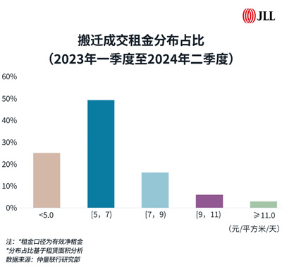 面對謹慎的市場情緒,新近竣工項目的業(yè)主在價格策略上釋放更大的議價空間,以此吸引租戶、提升入駐率,因此導致新竣工項目與成熟項目之間的價格差距逐漸擴大。同時,新竣工項目價格的“鯰魚效應(yīng)”促使成熟項目的業(yè)主更主動地調(diào)整價格策略以適應(yīng)當下的市場競爭。根據(jù)成交租金的分布情況,仲量聯(lián)行觀察到接近3/4的成交租金集中在7.0元/平方米/天以下的區(qū)間內(nèi)。