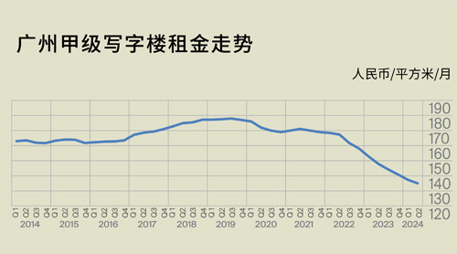 第二季度,廣州市的寫字樓租賃市場繼續(xù)呈現(xiàn)出下行趨勢,租金水平滑落至每月每平方米135.0元,較上月環(huán)比下挫1.7個百分點。