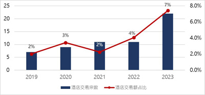 2019年-2023年酒店業(yè)態(tài)大宗交易宗數(shù)及交易額占比