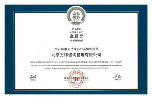 2025年12月,方緯咨詢憑借在可持續(xù)辦公領(lǐng)域的卓越實(shí)踐與品牌影響力,榮膺商業(yè)地產(chǎn)權(quán)威獎項(xiàng)“金廈獎”2025年度可持續(xù)辦公品牌價(jià)值獎。我司總經(jīng)理李秀明先生作為代表出席頒獎晚宴。此次獲獎不僅是對方緯咨詢過往成果的肯定,更是推動行業(yè)綠色轉(zhuǎn)型的新起點(diǎn)。