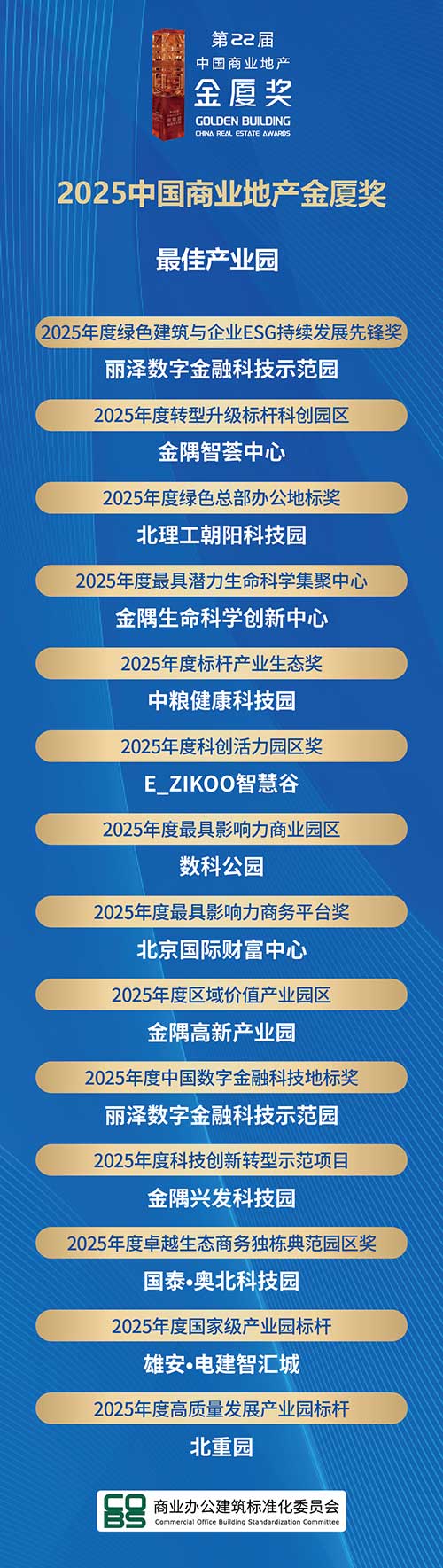 2025年12月23日,中國(guó)寫(xiě)字樓產(chǎn)業(yè)園發(fā)展論壇第22屆年會(huì)在北京富力萬(wàn)麗酒店盛大召開(kāi)。年會(huì)上,房訊指數(shù)CORC、商業(yè)辦公建筑標(biāo)準(zhǔn)化委員會(huì)聯(lián)合發(fā)布了《2025中國(guó)寫(xiě)字樓產(chǎn)業(yè)園競(jìng)爭(zhēng)力研究報(bào)告》,備受矚目的“2025中國(guó)寫(xiě)字樓產(chǎn)業(yè)園行業(yè)競(jìng)爭(zhēng)力100強(qiáng)”榜單正式揭曉,第22屆“中國(guó)商業(yè)地產(chǎn)金廈獎(jiǎng)GOLDENBUILDINGAWARDS”頒獎(jiǎng)盛典同步舉行。