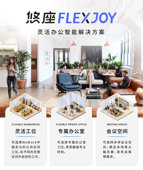 今年6月,我們?nèi)蚴装l(fā)的靈活辦公智能解決方案—— 「悠座FLEXJOY」,將辦公空間的使用權(quán)分解至 “小時級” 顆粒度,以“時間零售”的形式售賣辦公空間,構(gòu)建全流程數(shù)字化辦公體驗。