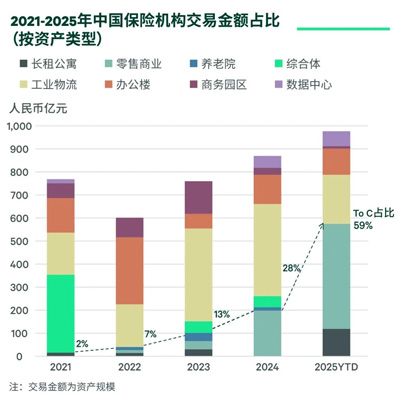 2022年以來(lái),受全球貨幣政策分化及地緣政治影響,外資在大宗交易中的活躍度顯著回落,而內(nèi)資買(mǎi)家(尤其是保險(xiǎn)資金和產(chǎn)業(yè)資本)成為市場(chǎng)絕對(duì)主力。2025年上半年,人民幣資本在大宗交易中的占比已接近100%,凸顯其流動(dòng)性核心地位。這其中,保險(xiǎn)機(jī)構(gòu)的資產(chǎn)配置呈現(xiàn)出兩大趨勢(shì):