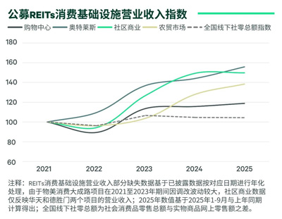 2021-2025年期間,購(gòu)物中心REITs、奧特萊斯REITs、社區(qū)商業(yè)REITs和農(nóng)貿(mào)市場(chǎng)REITs的營(yíng)業(yè)收入年復(fù)合增速分別為4.4%、11.7%、10.6%和8.5%,均領(lǐng)先于全國(guó)線下社零1.1%的增速。