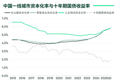 辦公樓、零售物業(yè)和倉(cāng)儲(chǔ)物流租金收入端繼續(xù)承壓,投資者的風(fēng)險(xiǎn)偏好普遍謹(jǐn)慎一致,令一線城市三大主流物業(yè)類(lèi)型資本化率逐步趨同。一線城市各資產(chǎn)類(lèi)型平均資本化率與十年期國(guó)債收益率之間的利差保持在約400個(gè)基點(diǎn)的高位。