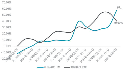 中國(guó)高科技產(chǎn)業(yè)在全球舞臺(tái)逐漸開(kāi)始扮演引領(lǐng)者角色。投資者開(kāi)始重新審視中國(guó)科技企業(yè)的價(jià)值,在資本市場(chǎng),從2024年底開(kāi)始,中國(guó)科技十杰在資本市場(chǎng)的表現(xiàn)亮眼,以2023年底為基準(zhǔn),十大科技類企業(yè)截止至2月底股價(jià)漲幅達(dá)57.39%(圖二)。