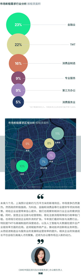 從行業(yè)需求來看,金融業(yè)依然處于主導(dǎo)地位,占比23%,主要受到投資管理和銀行等領(lǐng)域需求的推動。TMT行業(yè)穩(wěn)居第二,占比22%,得益于電商、通信等企業(yè)的擴(kuò)張以及部分軟件系統(tǒng)開發(fā)和互聯(lián)網(wǎng)平臺公司的租賃需求。第三位是消費(fèi)品制造業(yè),需求回升顯著,占比16%,尤其是零售快消品和3C電子產(chǎn)品等相關(guān)企業(yè)活躍度較高。第四位是專業(yè)服務(wù)業(yè),占比9%。值得一提的是,隨著消費(fèi)升級和服務(wù)業(yè)的進(jìn)一步發(fā)展,消費(fèi)服務(wù)業(yè)受到教育培訓(xùn)和健康護(hù)理領(lǐng)域的推動,首次進(jìn)入需求占比前六名。