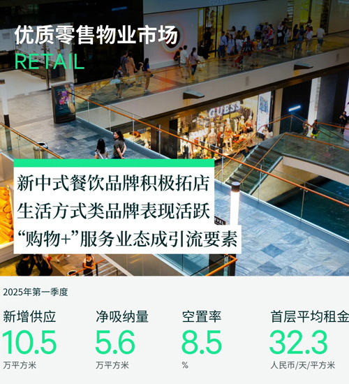 2025年第一季度,上海零售物業(yè)市場迎來了濱港商業(yè)中心項(xiàng)目的入市,為市場新增了10.5萬平方米的零售面積。全市零售物業(yè)空置率環(huán)比微升0.3個百分點(diǎn)至8.5%。