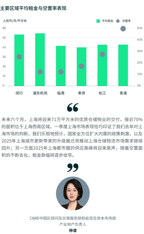 上海經(jīng)濟(jì)回暖,倉庫需求迎來復(fù)蘇,一季度凈吸納達(dá)16.4萬平方米,環(huán)同比均明顯回暖。今年1-2月上海規(guī)模以上工業(yè)總產(chǎn)值和社會消費(fèi)品零售總額連續(xù)兩個季度增速回升,帶動三方物流和消費(fèi)品及零售業(yè)企業(yè)擴(kuò)租,集中在上海南部的奉賢、臨港、金山和松江外圍區(qū)域(新浜和練塘)。當(dāng)中有來自三方物流和消費(fèi)品企業(yè)超過3萬平方米的整租案例,為疲弱的市場注入強(qiáng)心劑。但另一方面,上海核心物流市場出現(xiàn)了進(jìn)一步的騰退,源于大型綜合電商面積整合,閔行子市場空置率相應(yīng)攀升;同時上?崭邸⒑鐦蛞约八山磐さ群诵膮^(qū)位自去年四季度起的空置面積并未快速消納,顯示出租戶承租能力較為有限。