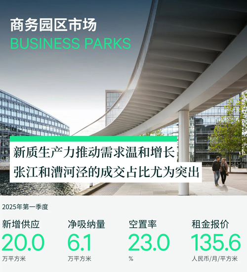 2025年第一季度,上海產(chǎn)業(yè)園區(qū)市場新增兩個供應(yīng),分別是浦江板塊的東方智媒城一期和漕河涇的鑫耀中心,新增面積合計(jì)199,527平方米,環(huán)比和同比均有所回落。受新增供應(yīng)和租戶變動的影響,季末整體空置率環(huán)比上升0.7個百分點(diǎn)至23%。