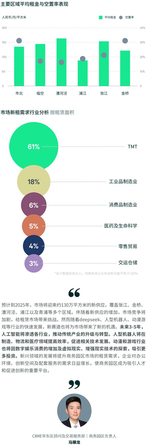 本季度凈吸納量為61,199平方米,環(huán)比和同比均有所上升,呈現(xiàn)出微弱的增長趨勢。在行業(yè)需求方面,TMT行業(yè)以61%的占比保持租賃需求首位,其中短視頻、網(wǎng)絡(luò)游戲和平臺互聯(lián)網(wǎng)的需求旺盛。其次是軟件系統(tǒng)開發(fā)、電商類企業(yè)以及人工智能相關(guān)需求,充分體現(xiàn)了數(shù)字娛樂的興起與新技術(shù)的創(chuàng)新驅(qū)動,使得內(nèi)容制作和用戶體驗(yàn)更加豐富多樣。工業(yè)品制造業(yè)以18%的占比位列第二,主要趨勢為半導(dǎo)體與芯片企業(yè)的搬遷。隨著技術(shù)進(jìn)步及應(yīng)用領(lǐng)域的擴(kuò)展,新材料與其他工業(yè)制品行業(yè)也實(shí)現(xiàn)了快速發(fā)展,這些產(chǎn)品在航空航天、電子、汽車和建筑等多個行業(yè)中得到廣泛應(yīng)用,推動了相關(guān)行業(yè)的發(fā)展與租賃需求。消費(fèi)品制造業(yè)受到新能源汽車類租戶的帶動,需求占比為6.1%,位列第三,醫(yī)藥及生命科學(xué)類租戶需求占比為5.5%。總體來看,一季度市場需求多元化趨勢明顯,表明各行業(yè)正朝著更加細(xì)分和專業(yè)化的方向發(fā)展。這種多樣性不僅反映了消費(fèi)者的需求變化,也顯示了技術(shù)進(jìn)步和產(chǎn)業(yè)結(jié)構(gòu)調(diào)整的深層次影響。各行業(yè)在技術(shù)創(chuàng)新、產(chǎn)品升級和服務(wù)轉(zhuǎn)型中不斷探索新的發(fā)展模式。