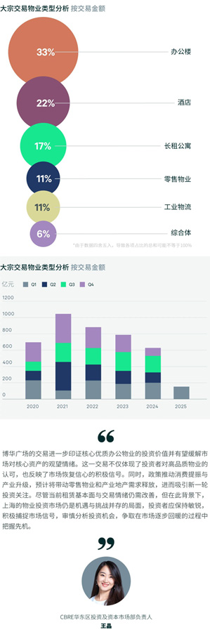 2025年第一季度,上海物業(yè)投資市場共錄得18筆交易,交易總額約151.7億元,環(huán)比上漲36.3%。盡管市場交易金額有所上升,但整體觀望氛圍仍然濃厚。值得一提的是,博華廣場交易作為近三年來唯一的超百億級單體項(xiàng)目成交,有望為市場注入積極信號。
