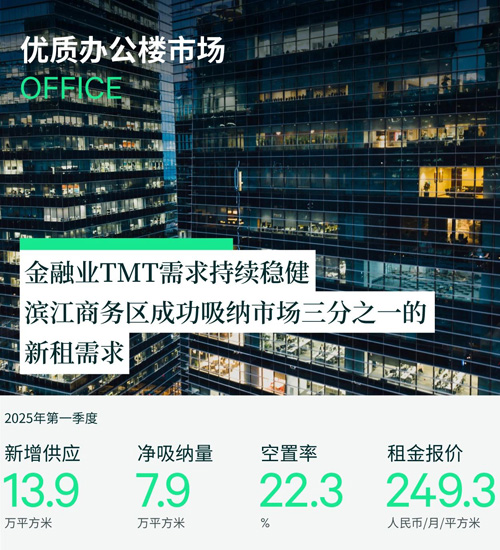 2025年第一季度,上海辦公樓市場共錄得兩個新項(xiàng)目交付,分別是靜安區(qū)的靜投中心以及徐匯區(qū)的徐匯萬科中心三期(T2),共計(jì)體量13.9萬平方米。淡季不淡,盡管受到假期因素的影響,一季度的數(shù)據(jù)表現(xiàn)卻顯示出回暖的潛在趨勢。全市凈吸納量環(huán)比和同環(huán)比均有提升,達(dá)到了7.9萬平方米,整體空置率環(huán)比微升0.2個百分點(diǎn),達(dá)到22.3%。