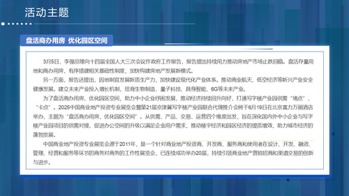 為了盤活商辦用房,優(yōu)化園區(qū)空間,助力中小企業(yè)紓困發(fā)展,推動(dòng)經(jīng)濟(jì)持續(xù)回升向好,打通寫字樓產(chǎn)業(yè)園供需“堵點(diǎn)”、“卡點(diǎn)”。2025中國商業(yè)地產(chǎn)投資專業(yè)展覽會(huì)暨第21屆京津冀寫字樓產(chǎn)業(yè)園聯(lián)合代理推介會(huì)將于6月19日在北京富力萬麗酒店舉辦,主題為“盤活商辦用房,優(yōu)化園區(qū)空間”。從供需、產(chǎn)品、交易、運(yùn)營四個(gè)維度出發(fā),旨在深化國內(nèi)外中小企業(yè)與寫字樓產(chǎn)業(yè)園項(xiàng)目的供需對(duì)接,促進(jìn)辦公空間的升級(jí)以滿足企業(yè)用戶需求,推動(dòng)樓宇經(jīng)濟(jì)和園區(qū)經(jīng)濟(jì)的提質(zhì)增效,助力城市經(jīng)濟(jì)的蓬勃發(fā)展。