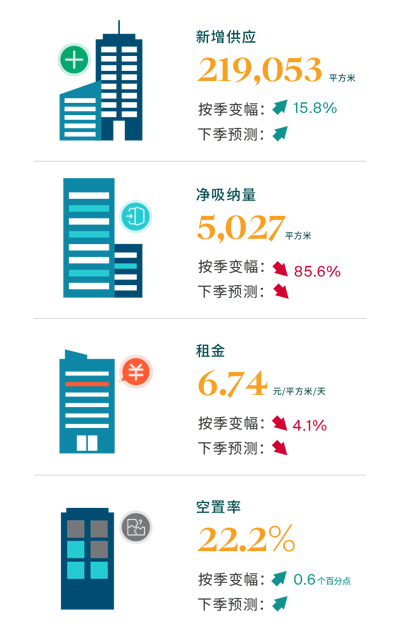 第一季度,上海甲級寫字樓市場租金繼續(xù)環(huán)比下跌4.1%,至每天每平方米人民幣6.74元,各個寫字樓子市場均有不同程度的租金下滑。在有限的市場需求下,核心商務區(qū)的優(yōu)渥位置、新興商務區(qū)的樓齡新和租金低等優(yōu)勢因素與中央商務區(qū)形成錯位競爭。中央商務區(qū)去化壓力加劇,導致業(yè)主大幅調(diào)低市場租金報價。