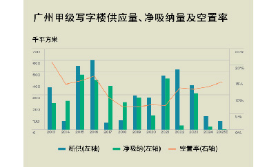 第一季度,城祥大廈作為本季度唯一新增供應(yīng)項(xiàng)目入市,為市場注入約7.5萬平方米的新增供應(yīng),全市空置率環(huán)比攀升1.4個(gè)百分點(diǎn)至14.7%。盡管供應(yīng)壓力顯現(xiàn),但需求端復(fù)蘇信號(hào)顯著,凈吸納量自2024年第四季度的負(fù)值區(qū)間反彈至4,353平方米,標(biāo)志著市場進(jìn)入階段性修復(fù)期。廣州甲級(jí)寫字樓市場呈現(xiàn)供需動(dòng)態(tài)調(diào)整的復(fù)雜格局,短期內(nèi)需求回暖的動(dòng)能弱于供應(yīng)擴(kuò)張的壓力。