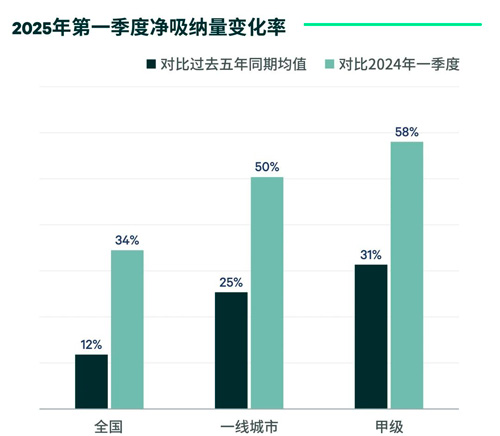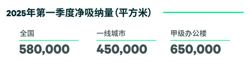 2025年第一季度,全國十大主要城市的辦公樓凈吸納量同比增長34%,高于過去五年同期均值12%,辦公樓市場初現(xiàn)復蘇跡象。