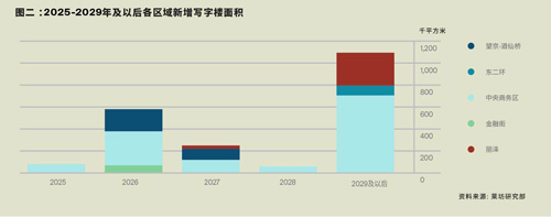 2026將是未來的供應(yīng)高峰,預(yù)計將有580,000平方米的寫字樓供應(yīng)。其中,CBD區(qū)域預(yù)計將有兩個項目竣工,分別為CBD Z3和Z6項目,共計約310,000平方米。此外,2029年預(yù)計將有420,000平方米竣工交付,仍然以CBD區(qū)域為主。