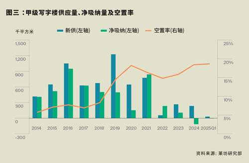 2025年第一季度,北京甲級寫字樓市場新增供應(yīng)有限,只有一個新項目竣工交付,即中海金融中心1號樓。中海金融中心位于北京金融街南拓區(qū),其中1號樓主要用于出租,建筑面積為32,614.43平方米,寫字樓面積約為30,000平方米。展望2025年后三個季度,預(yù)計僅有齊家園外交辦公大樓(暫定名)這一項目在第三季度竣工交付,該項目寫字樓面積約為80,000平方米。