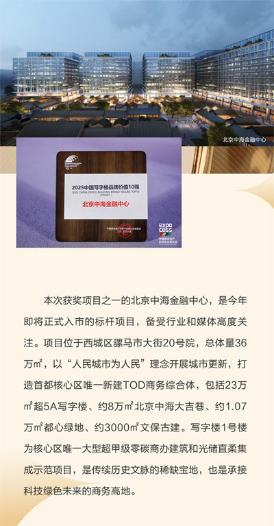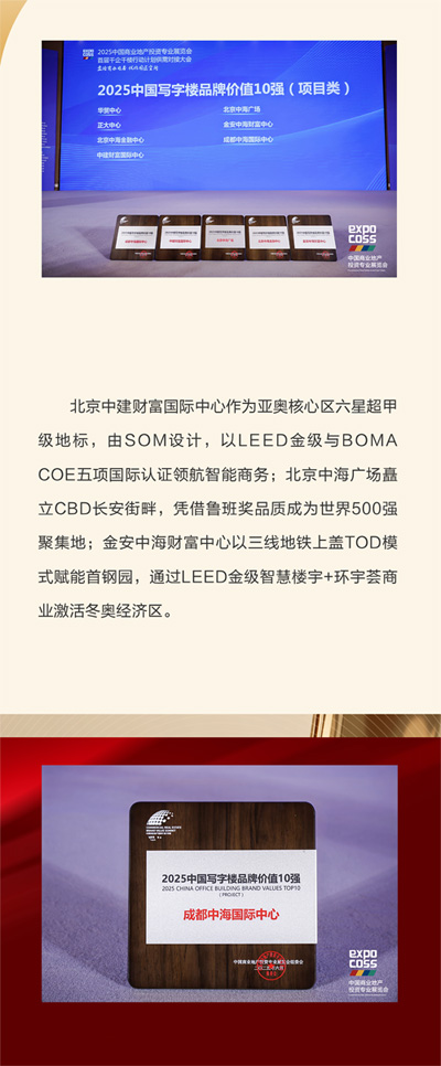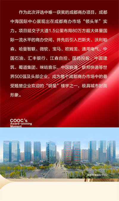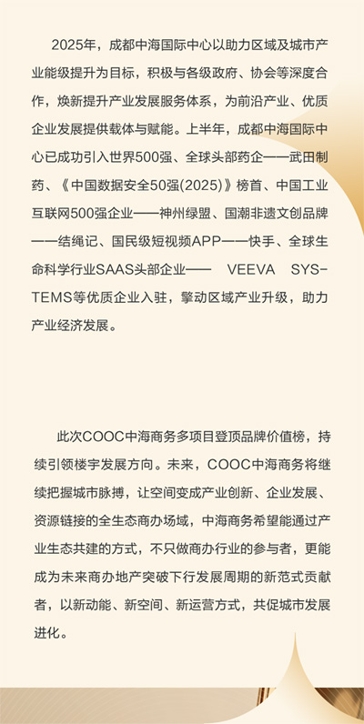 [提要]COOC中海商務(wù)旗下北京中建財富國際中心、北京中海廣場、北京中海金融中心、金安中海財富中心以及成都中海國際中心,榮獲2025中國寫字樓品牌價值10強,以優(yōu)異的資產(chǎn)運營管理和商業(yè)生態(tài)體系構(gòu)建能力成就業(yè)界典范。