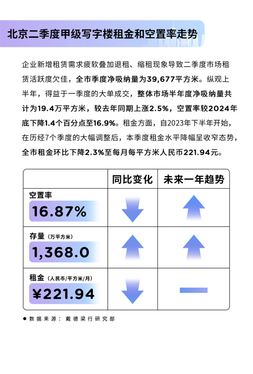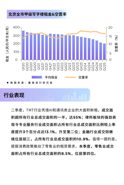 戴德梁行:北京二季度甲級寫字樓租金和空置率走勢