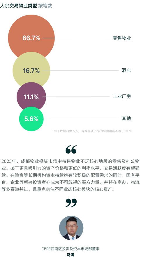得益于提振消費為零售物業(yè)運營表現(xiàn)提供助力,相關(guān)物業(yè)持續(xù)受到關(guān)注,上半年錄得12筆零售物業(yè)和2筆星級酒店的交易。與此同時,產(chǎn)業(yè)升級下,工業(yè)廠房的交易延續(xù)熱度,上半年錄得2筆交易,分別位于雙流和新津。