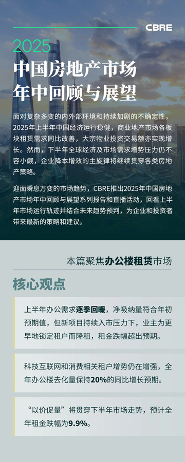 站在業(yè)主角度,盡管上半年不少項(xiàng)目主動(dòng)加大租金調(diào)整幅度促進(jìn)去化并取得一定成效,但下半年370萬新增供應(yīng)的入市意味著除北京外的大部分城市供應(yīng)端競爭將進(jìn)一步加劇,租金面臨持續(xù)下行壓力。CBRE下調(diào)2025年全國辦公樓租金跌幅至9.9%,跌幅較年初預(yù)測(cè)值擴(kuò)大3.2個(gè)百分點(diǎn)。