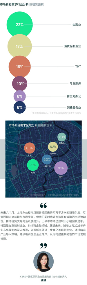 從行業(yè)需求來(lái)看,上半年金融業(yè)以22%的占比繼續(xù)領(lǐng)跑市場(chǎng),主要受到基金和非銀金融機(jī)構(gòu)的推動(dòng);消費(fèi)品制造業(yè)位居第二,占比17%,主要來(lái)自快消品和家居類(lèi)企業(yè)的擴(kuò)張需求;TMT位列第三,占比達(dá)16%,跨境電商和互聯(lián)網(wǎng)平臺(tái)公司的擴(kuò)張成為其主要驅(qū)動(dòng)力;專業(yè)服務(wù)業(yè)排名第四,占比10%,主要來(lái)自法律和傳媒類(lèi)企業(yè)的搬遷擴(kuò)張需求;此外,第三方辦公運(yùn)營(yíng)回歸前五,占比達(dá)6%,反映出在市場(chǎng)環(huán)境調(diào)整背景下,部分業(yè)主開(kāi)始傾向合作運(yùn)營(yíng)模式以提升物業(yè)吸引力。