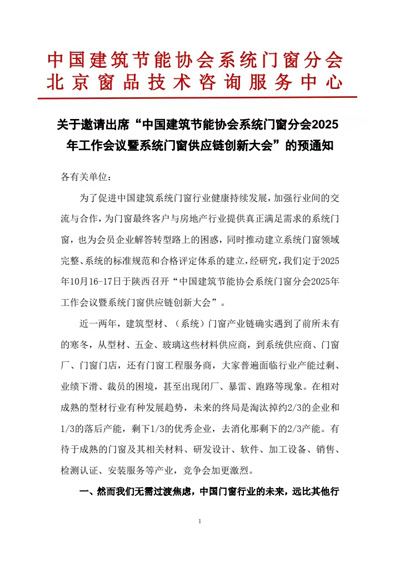 [提要]關于邀請出席“中國建筑節(jié)能協(xié)會系統(tǒng)門窗分會2025年工作會議暨系統(tǒng)門窗供應鏈創(chuàng)新大會”的預通知