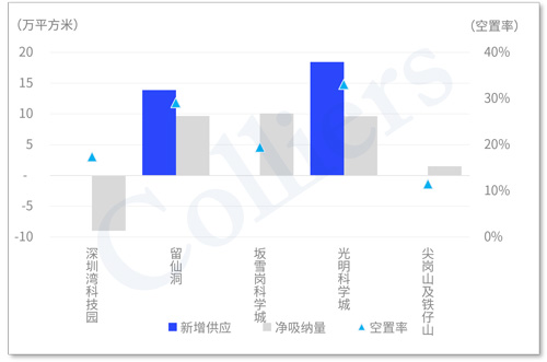 其中坂雪崗科學(xué)城、留仙洞在優(yōu)質(zhì)項(xiàng)目不斷增加、良好的產(chǎn)業(yè)基礎(chǔ)、靈活的租賃策略及總部自用帶動(dòng)下均實(shí)現(xiàn)約10萬平方米的凈吸納量。