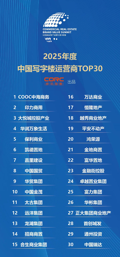 以下為2025年度中國寫字樓運營商TOP30研究成果: