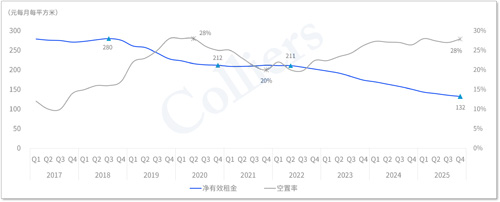 盡管新增需求逐步釋放為市場(chǎng)帶來(lái)曙光,但供應(yīng)高峰之下租金仍處于下行通道。2025年末,深圳全市甲級(jí)寫(xiě)字樓平均凈有效租金約132.2元/平方米/月,同比下降12.3%,租金同比降幅逐季收窄;優(yōu)質(zhì)研發(fā)辦公凈有效租金約84.1元/平方米/月,同比下降7.4%。盡管主動(dòng)下調(diào)租金的存量項(xiàng)目數(shù)量趨于減少,但受個(gè)別項(xiàng)目的經(jīng)營(yíng)壓力與結(jié)構(gòu)性市場(chǎng)因素影響,整體租金水平仍延續(xù)下行趨勢(shì)。
