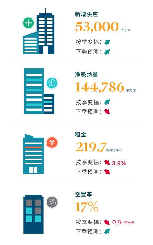 北京甲級寫字樓市場整體租金水平仍處于下行周期,全市平均租金降至每月每平方米人民幣219.7元,環(huán)比下降3.9%,同比下降12.7%。