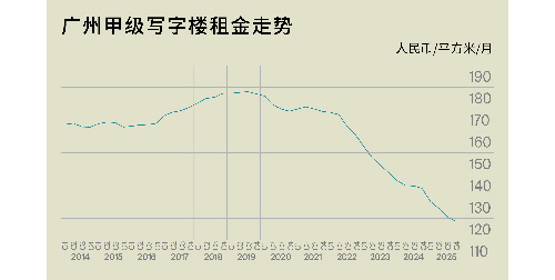 2025年第四季度,廣州全市寫字樓市場租金延續(xù)下行趨勢,環(huán)比下滑1.7%至118.7元/平方米/月,但降幅已收窄至全年最低,價格調整從“急跌”轉向“緩釋”;仡櫲辏准墝懽謽瞧骄饨鸬南滦泄(jié)奏呈現(xiàn)階段性放緩,不過波動幅度仍處于近十年高位。