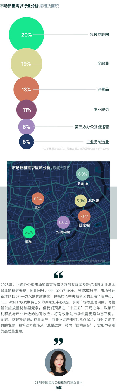從區(qū)位表現(xiàn)來看,陸家嘴以7.8%的占比位列全市第一,需求主要來自板塊內(nèi)部搬遷,專業(yè)服務(wù)業(yè)流動(dòng)尤為突出,而小部分增量需求則主要由金融及TMT企業(yè)貢獻(xiàn)。在高租金客戶外溢的壓力下,陸家嘴通過主動(dòng)降租等優(yōu)惠措施吸引追求性價(jià)比的租戶,板塊內(nèi)部流動(dòng)活躍度明顯提升;五角場以6.9%的占比位列第二,以字節(jié)跳動(dòng)為首,TMT產(chǎn)業(yè)集聚效應(yīng)進(jìn)一步增強(qiáng);淮海中路排名第三,占比6.6%,消費(fèi)品和金融行業(yè)貢獻(xiàn)突出;北外灘位列第四,占比6.3%,以金融和TMT企業(yè)的搬遷需求為主,律所及酒店租賃亦表現(xiàn)活躍;真如板塊排名第五,占比6.1%。租金方面,2025年全市租金報(bào)價(jià)同比下降5.2%至每月每平方米240.7元,有效租金則受業(yè)主進(jìn)一步的讓利措施影響,同比下降9.5%至165.2元。