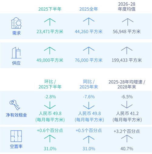 2025年下半年,市場(chǎng)租金仍處于下行通道,但租金的降幅已有所收窄,環(huán)比下降2.8%,同比下降7.6%至49.8元每月每平方米。