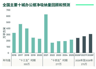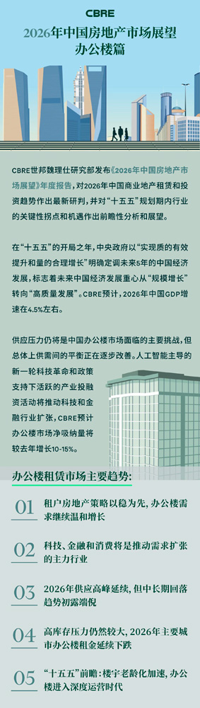 CBRE預(yù)計(jì)2026年辦公樓需求將繼續(xù)穩(wěn)步增長(zhǎng),主要十城凈吸納量有望同比上漲10-15%。