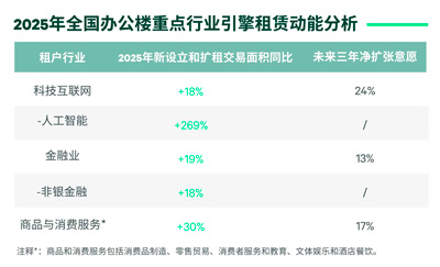 在我們2025年的中國(guó)辦公樓租戶調(diào)查中,科技互聯(lián)網(wǎng)、商品與消費(fèi)服務(wù)和金融對(duì)未來(lái)三年辦公空間的擴(kuò)張意愿最強(qiáng),凈擴(kuò)張意愿分別達(dá)到24%、17%和13%,高于全行業(yè)平均的11%。這三大行業(yè)在2025年新租交易面積中的占比達(dá)到68%。