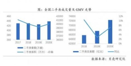 貝殼研究院數(shù)據(jù)顯示,2019年二手房交易額增長(zhǎng)2.8%,達(dá)到6.5萬(wàn)億,2017年~2019年連續(xù)三年二手房銷售套數(shù)超過(guò)400萬(wàn)套,銷售額超過(guò)6萬(wàn)億。2019年,新房銷售額再創(chuàng)新高,增長(zhǎng)9%至13.8萬(wàn)億。