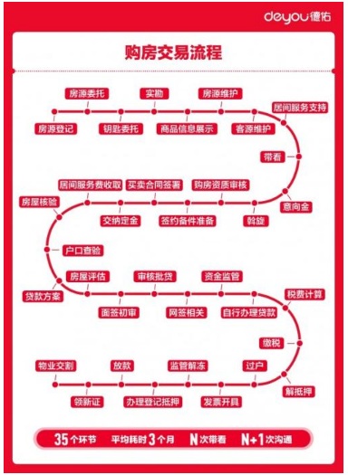 以北京為例,如果把登記房源、接受業(yè)主委托視為起點(diǎn),把消費(fèi)者完成物業(yè)交割視為終點(diǎn),完成一套二手房交易平均大概需要104天。其中,接受委托、匹配房源、撮合成交是經(jīng)紀(jì)服務(wù)的關(guān)鍵動(dòng)作,但在整個(gè)交易周期占比較小,約為38天;簽約后的面簽、貸款、繳稅環(huán)節(jié),耗時(shí)長(zhǎng)且較容易出現(xiàn)消費(fèi)者投訴類問(wèn)題,屬于后續(xù)服務(wù)性質(zhì)的工作。