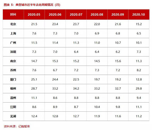 10月,我們監(jiān)測(cè)的城市商品住宅庫存面積環(huán)比整體下降,概因9月住宅市場回暖使各城市庫存下行,使本月去化周期縮短。
