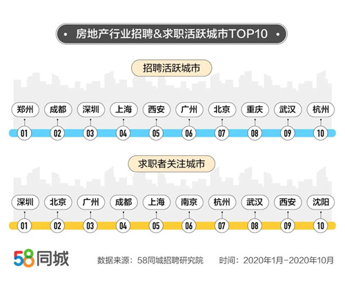 分城市看,1-10月,房地產(chǎn)業(yè)招聘活躍城市前10名為鄭州、成都、深圳、上海、西安、廣州、北京、重慶、武漢、杭州。