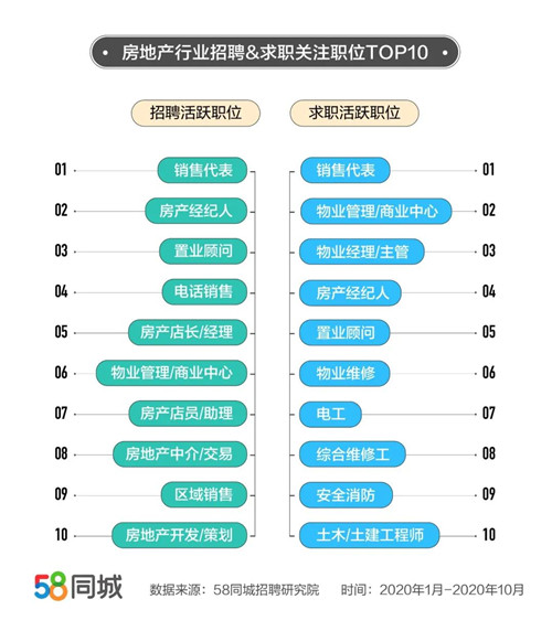 58同城招聘研究院數(shù)據(jù)顯示,2020年1-10月,房地產(chǎn)業(yè)整體求職需求同比上升5.01%。