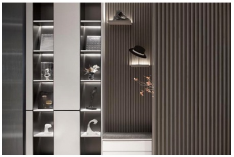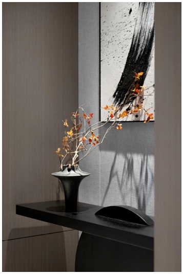 穿過玄關(guān)屏風(fēng)之后,大氣朗闊的客廳空間豁然鋪開。方正有序的格局里,以深色格柵排列表達(dá)緊湊感,白淺紋巖板表現(xiàn)疏朗感,節(jié)奏清晰分明,進而打破單調(diào)界限。整面落地窗更將都市景觀融匯到客廳,帶來自然天際的仰望與現(xiàn)代夜景的璀璨。細(xì)鑒每件物品,都涌動著藝術(shù)靈性,極具先鋒雕塑感,精奢情調(diào)與中式水墨律動兼收并蓄。