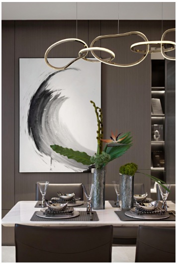 用餐區(qū)小到餐具的擺置搭配,大至掛畫的考究,都彰顯著高雅輕奢的氣質(zhì)。華麗的金屬吊燈如躍動的音符,附著一家人齊聚進餐的歡聲笑語、杯盞晃動、光影交錯著漸變著,一曲愛與美食的家庭樂章就這樣欣然奏響,綿逸柔遠(yuǎn)。