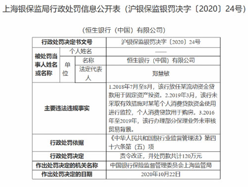 銀保監(jiān)會網(wǎng)站消息,恒生銀行(中國)有限公司因2018年7月至8月,放任某流動資金貸款用于固定資產(chǎn)投資。2019年3月,未采取有效措施對某筆個人消費貸款資金使用進行監(jiān)控,個人消費貸款用于購房。2016年至2019年,辦理部分保理業(yè)務(wù)未審核貿(mào)易背景。三項違法違紀(jì)事實被上海銀保監(jiān)局處罰款120萬元并責(zé)令改正。