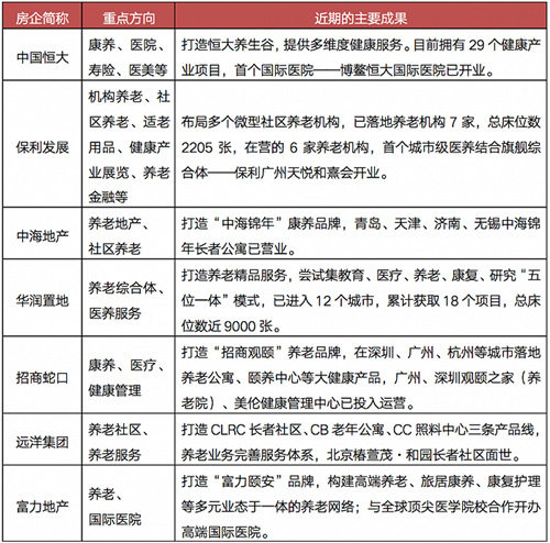 早些年進入健康領域的房企陸續(xù)通過定期公告披露布局進展,整體看來,通過養(yǎng)老概念入局是大部分房企的選擇,恒大、保利、華潤、招商、遠洋和富力的健康布局均涉及這方面的布局,相關項目陸續(xù)開始運營。這些項目大部分定位利潤較高的中高端市場。